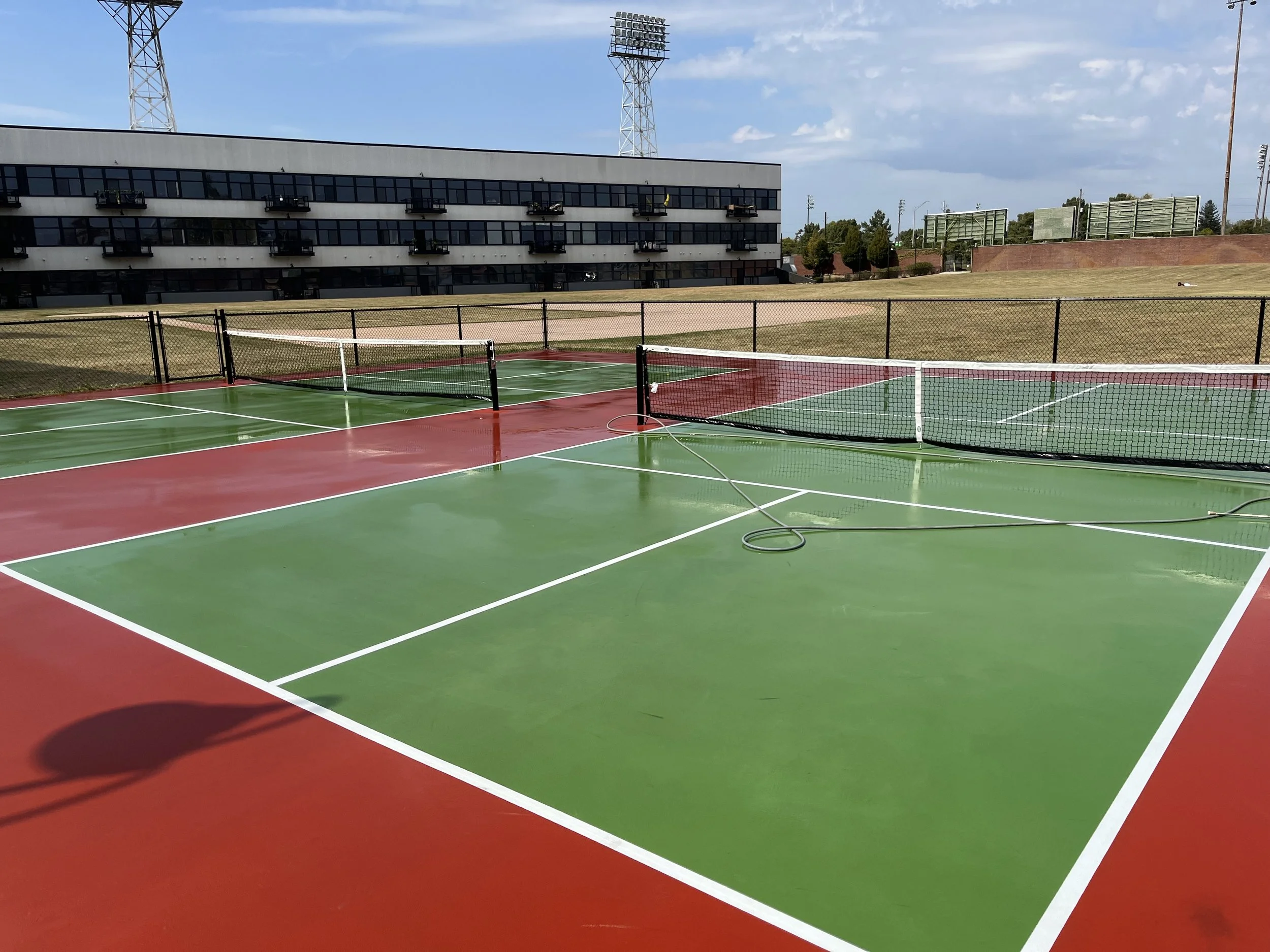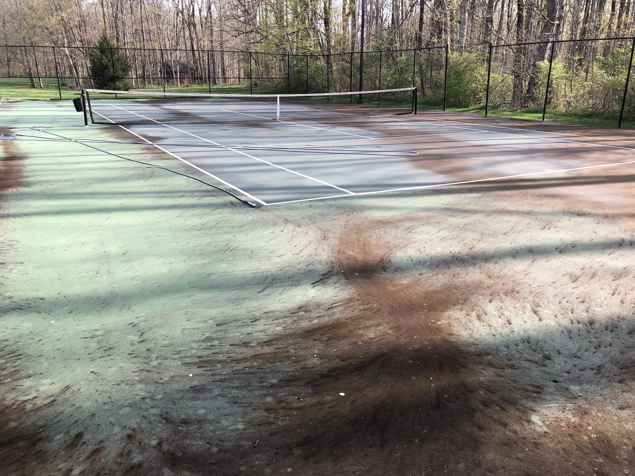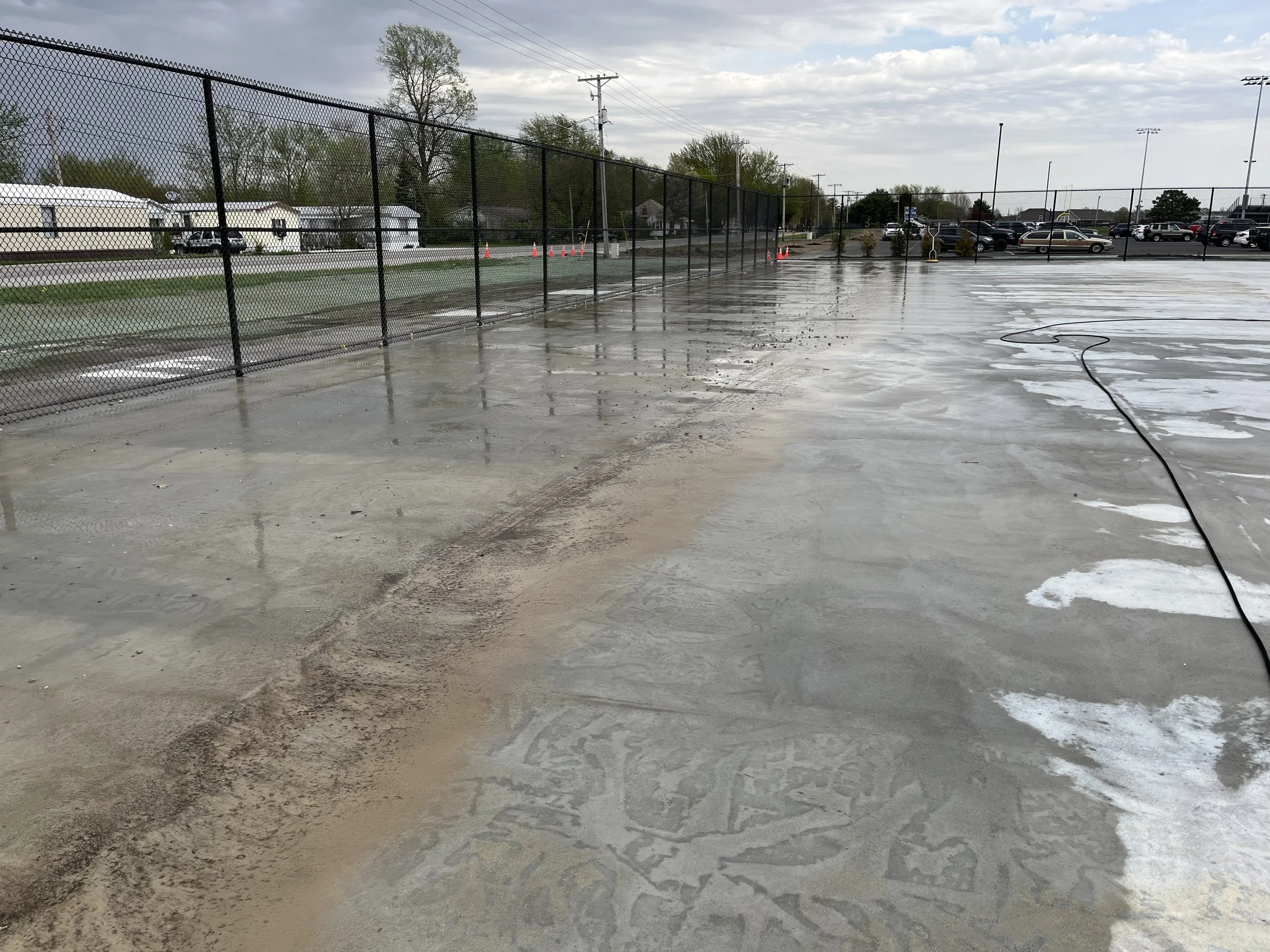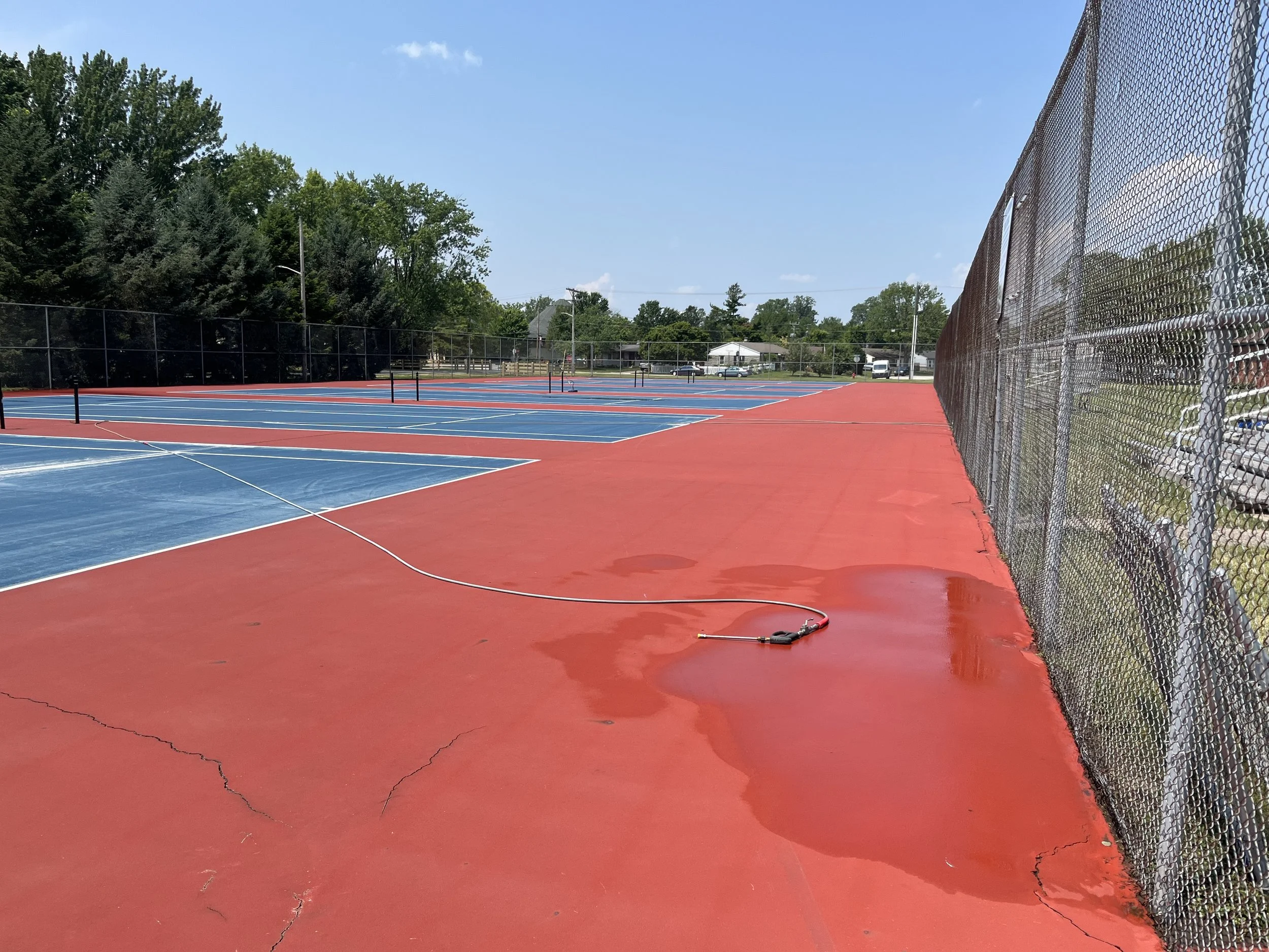 Cleaning courts prior to a new surface being applied.